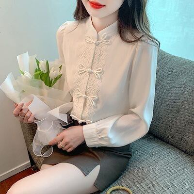 リボン 2025 立ち襟長袖シフォンシャツ レディース ナショナルトップス