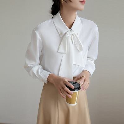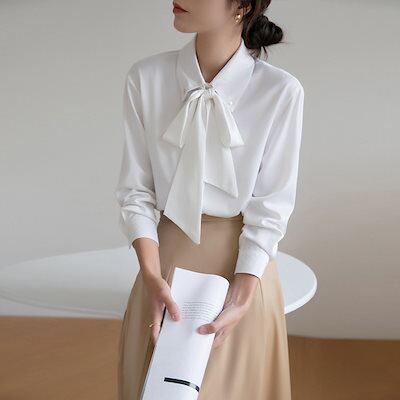 リボン 2025春新作弓しわサテンシャツレディース長袖シャツ