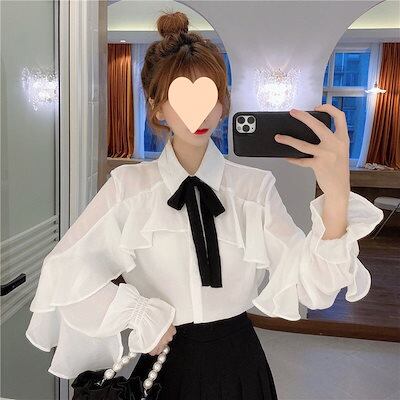 春秋 新作スタイル 蝶ネクタイ シャツ レース フレアスリーブ フリルエッジ 気質 シフォン ファッショナブル 白シャツ レディース 韓国ファッション