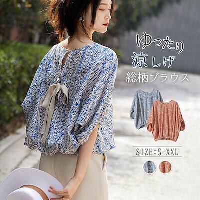 ブラウス シャツブラウス レディース 夏 トップス 七分袖 バックリボン 後ろリボン きれいめ ギャザー 半袖 薄手 体型カバー 着痩せ ゆったり Tシャツ プルオーバー カジュアル ゆるっと レイヤ
