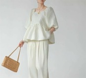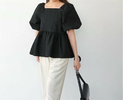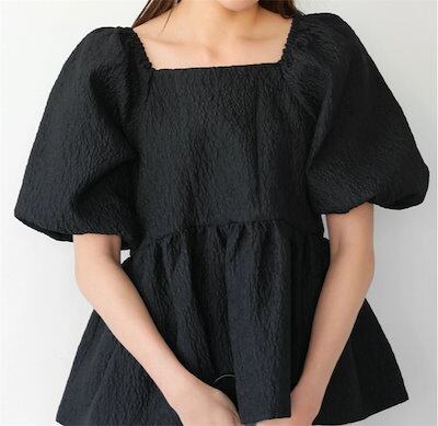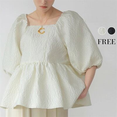 ブラウス レディース ジャガード 半袖 五分袖 バルーン袖 パフ袖 エンボス 凸凹 膨れ バックリボン お洒落 フレア スクエアネック プルオーバー T-シャツ レディース ロングブラウス トップス