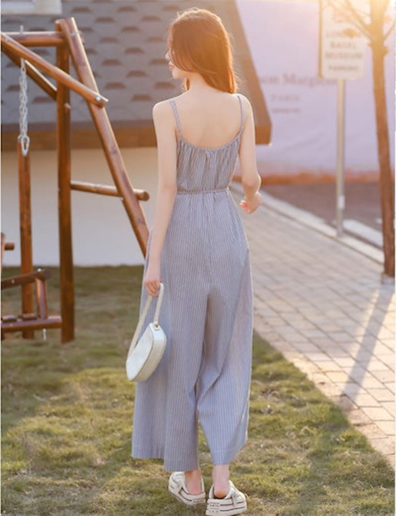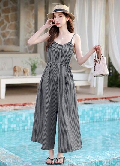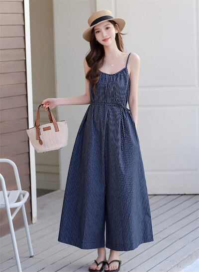 オールインワン サロペット レディース オーバーオール 春 夏 サロペットパンツ ワイドパンツ ガウチョパンツ 涼しい ロング丈 パンツドレス ストライプ柄 ノースリーブ 可愛い ゆったり 重ね着 楽