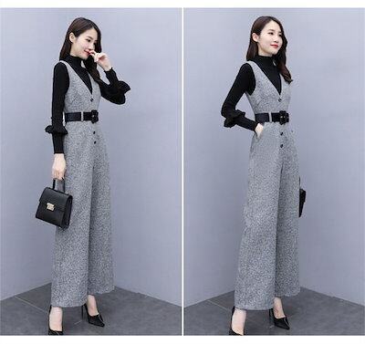 サロペット パンツ レディース ワイドパンツ つなぎ オールインワン 大人 春 秋 冬 深vネック カジュアル シンプル おしゃれ きれいめ 長袖 通勤 セレモニースーツ 入学式 卒業式 卒園式 入園