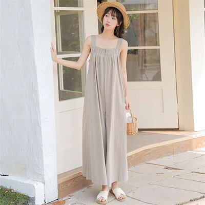 サロペットパンツ レディース 綿麻風 ノースリーブ オールインワン オーバーオール 薄手 春 夏 秋 つなぎ ワイドパンツ サイドポケット バックリボン サロペット ロングパンツ シンプル 無地 カジ