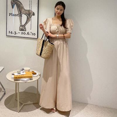 オールインワン レディース サロペット 春 夏 オーバーオール 半袖 パフスリーブ 着痩せ ワイドパンツ 涼しい シンプル ポケット付き ガウチョ パンツドレス ギャザー 体型カバー ゆったり きれい