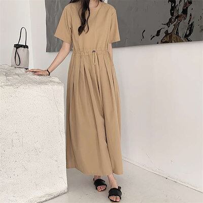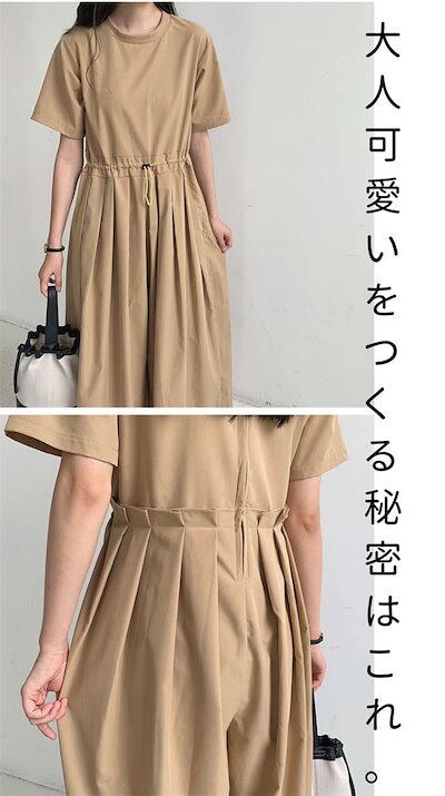 オールインワン レディース パンツドレス 半袖 春夏 きれいめ オーバーオール サロペット サロペ つなぎ パンツ ワイドパンツ ロングパンツ ロング クルーネック 無地 ゆったり 涼しい 体型カバー