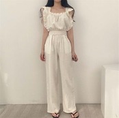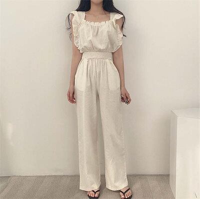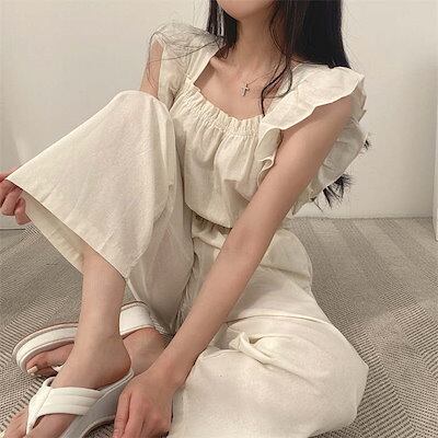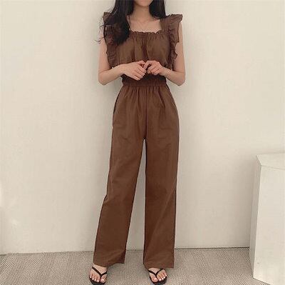 サロペット オールインワン パンツドレス レディース 春 夏 秋 フリルショルダー ノースリーブ ハイウエスト 無地 ドレスパンツ オーバーオール ポケット ワイドパンツ シンプル ゆったり おしゃれ