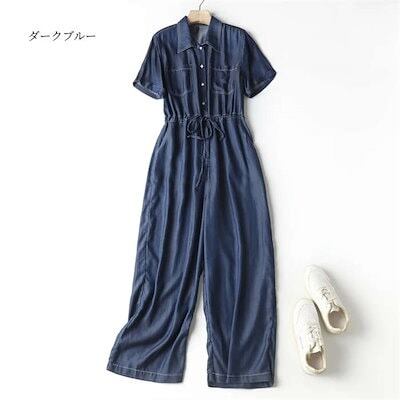 デニムオールインワン レディース テンセル サロペット ロングパンツ 夏 春 半袖 無地 オールインワン サロペット つなぎ オーバーオール ひんやり 涼しい 大人 カジュアル シンプル 通勤 美脚