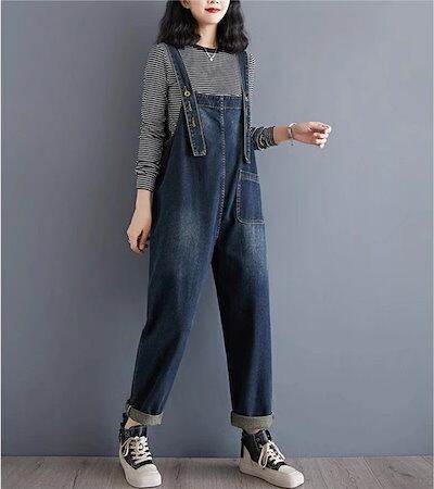前後2Way デニムサロペット レディース コーデ 秋 サロペット デニム 大きいサイズ ワイド パンツ オーバーオール ロング 体型カバー ゆったり 楽ちん 大人 デニムワイドパンツ 春 夏 秋 無