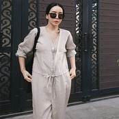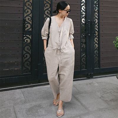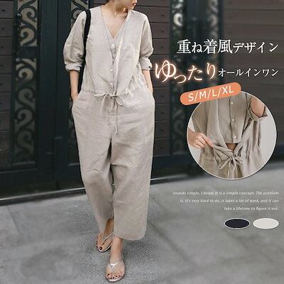 オールインワン レディース サロペット 九分丈 春 夏 ゆったり パンツドレス つなぎ オーバーオール 綿麻 パンツ ワイドパンツ ワイド クルーネック ポケット 無地 コットン 涼しい 体型カバー