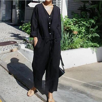 オールインワン サロペット レディース つなぎ 春 秋 連体服 オーバーオール 長袖 ロングパンツ 九分丈 Vネック 無地 綿麻風 古着風 マタニティ ゆったり 作業服 ポケット 着痩せ きれいめ ベ
