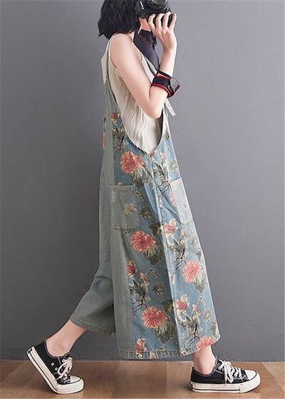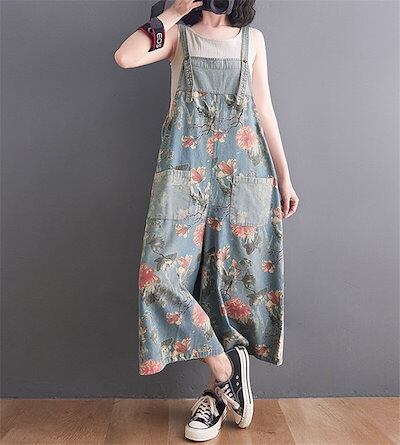 サロペット レディース オールインワン デニムパンツ デニムワイドパンツ デニム ロング丈 ロングパンツ 春 夏 ゆったり 花柄 総柄 体型カバー 大きいサイズ カジュアル 可愛い デニムサロペット