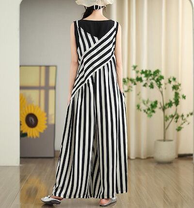 サロペット オールインワン チェック ストライプ パンツ レディース 夏 ワイドパンツ オーバーオール 9分丈 ロング丈 ノースリーブ オーバサイズ おしゃれ 大きめ 春 夏