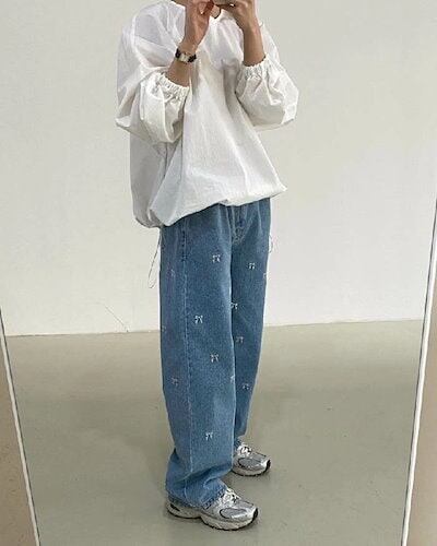ワイドパンツ デニム リボン刺?付き レディース 春 秋 ガウチョパンツ 花柄 リボン刺? デニムパンツ 体型カバー ハイウェスト 大きいサイズ おしゃれ ゆったり カジュアル ナチュラル カジュア