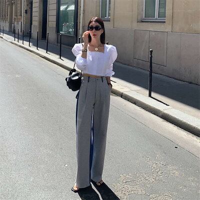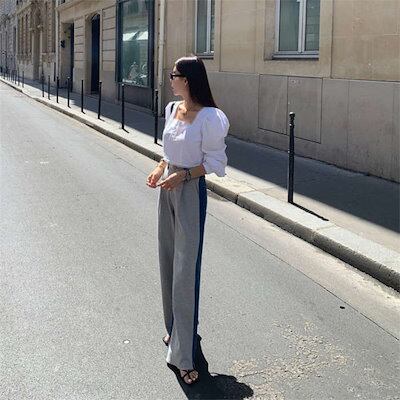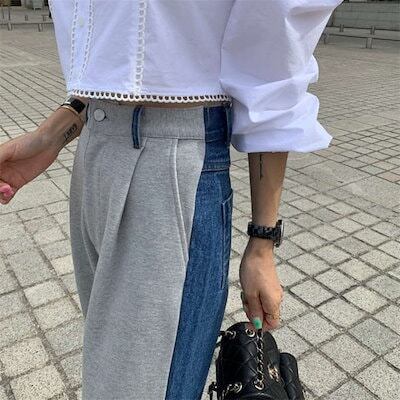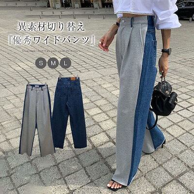 ワイドパンツ レディース 春 秋 異素材切り替え ロング丈 デニム スウェット バイカラー 華奢見え 体型カバー おしゃれ ゆったり カジュアル ナチュラルカジュアル 着痩せ ボトムス 春物 春 秋