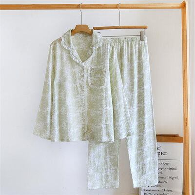 ガーゼ パジャマ レディース 花柄 総柄 ルームウェア 春 秋 冬 長袖 ロングパンツ 部屋着 セットアップ 2点セット 寝間着 寝巻き 上下セット 前開き 大きいサイズ 大人 レース フェミニン 折