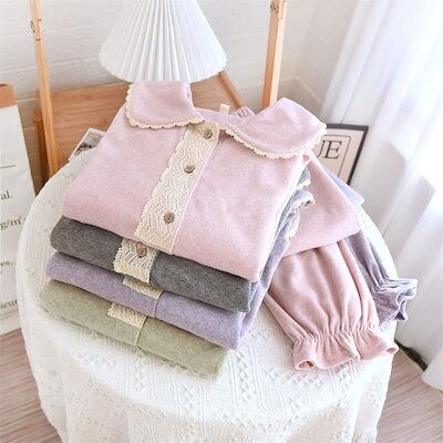 パジャマ レディース セットアップ ルームウェア 春 秋 冬 長袖 襟付き レース 切り替え 丸襟 前開き 無地 ロングパンツ 裾フリル ウエストゴム 部屋着 2点セット 寝間着 寝巻き 上下セット