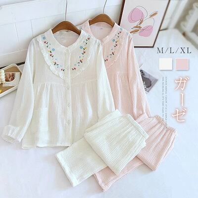 ガーゼ パジャマ レディース ルームウェア パンツ 春 秋 ガーゼコットン 刺繍 花柄 フリル 春秋 長袖 ダブルガーゼ 2重ガーゼ 綿 部屋着 セットアップ 2点セット ナイト 寝間着 寝巻き 上下