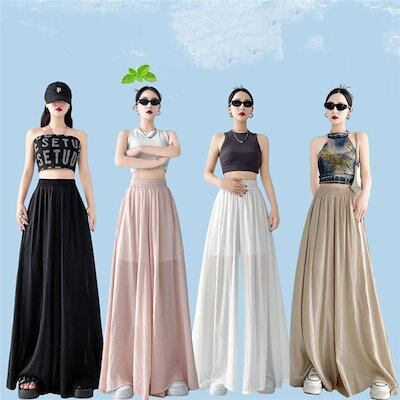 ガウチョパンツ パンツ レディース フレアスカート 透け感 冷感パンツ レディース イージーパンツ 春夏 ひんやり 接触冷感 ウェストゴム