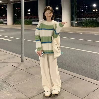 レディース 春 セットアップ 新作 ストライプ ニットセーター & ワイドパンツ カジュアル 2点セット おしゃれ トレンドコーデ 韓国 セットアップ セットアップ スウェット セットアップ セットア