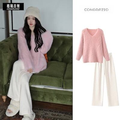 レディース 春 セットアップ Vネック ニットセーター&ボア裏起毛ワイドパンツ ルーズシルエット リラックスコーデ 2点セット パステルカラー 韓国 セットアップ セットアップ スウェット セットアッ