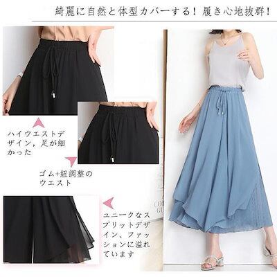 ガウチョパンツ 裾プリーツ 切り替え ワイドパンツ 春 夏 秋 レディース シフォン フレアパンツ スカーチョ ゆったり