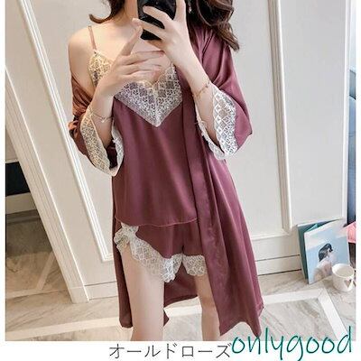 パジャマ ルームウェア 部屋着 レディース 夏 春 ガウン キャミソール 短パン ショートパンツ 三点セット セットアップ サテン風 レース Vネック 大き