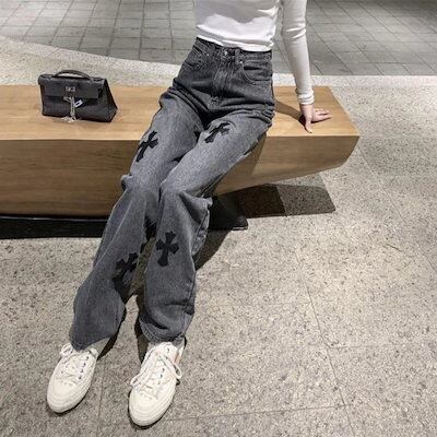 メガ割-PUレザークロスジーンズレディースシンストレートルーズワイドレッグパンツハイウエストスリムフィットモ