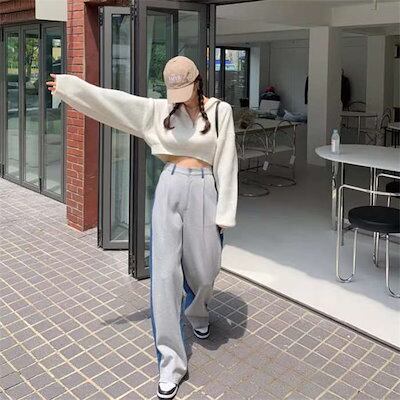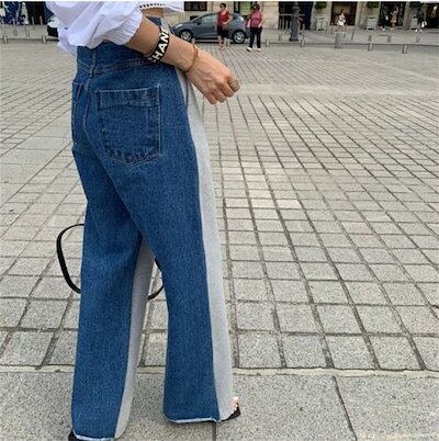 異素材切り替え パンツ レディース 春 秋 デニム パンツ バイカラー スウェット ストレートパンツ ロングパンツ 切り替え ウエストゴム ワイドパンツ ボトムス ロング丈 着痩せ 体型カバー 美脚