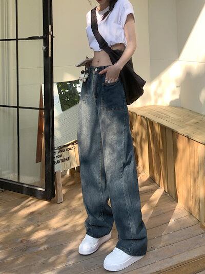 メガ割-レトロなハイウエストデザイン感デニム女性のの新作ゆったりストレートワイドパンツラッシュデニムボトムス 25 レディース