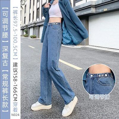 ジレンズ脚長効果 ジーパンレディース ストレートジーンズ ハイウエスト ゆとりがある ワイドパンツ ラッパズボン 調整可能 スキニージーンズ ジーパン