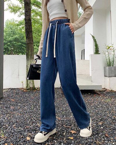 涼感 デニムパンツ レディース パンツ テンセル 夏 デニム ストレート ワイド ひんやり ゆるい ウェストゴム ストレートパンツ きれいめ チノパンツ ジーンズ ロング イージーパンツ セミワイド