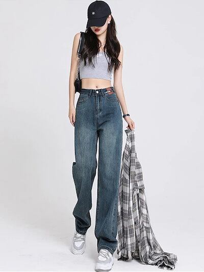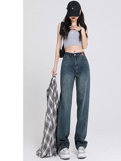 レトロ ワイド ジーンズ レディース 細いウエスト ハイウエスト 細いストレート ゆったり 小さめ ロング ドラッグ パンツ