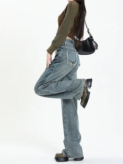レトロ ワイドパンツ デニムボトムス レディース ニューデザイン ハイウェスト ストレートパンツ モップパンツ デザイン感 ゆったり ドレープ感2052
