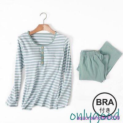 パジャマ レディース 春夏秋冬 4色 長袖 丸首 ルームウェア 寝巻き 2点セット ストライプ 長ズボン Bra付き 寝間着 部屋着 体型カバー 韓国風 可愛い