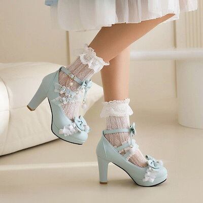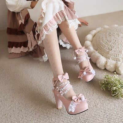 【メガ割 】ロリータシューズ韓版版スイートリボンプリンセスロリータシューズ厚手シングルシューズレディースハイヒール