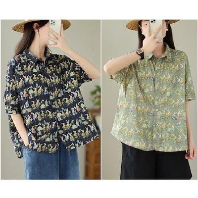 シャツ レディース ブラウス 夏新作 花柄 折り襟 半袖 綿 トップス 着心地がいい 大人可愛い ゆったりシルエット おすすめ