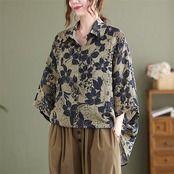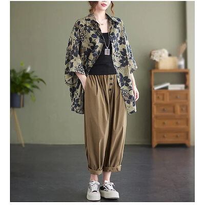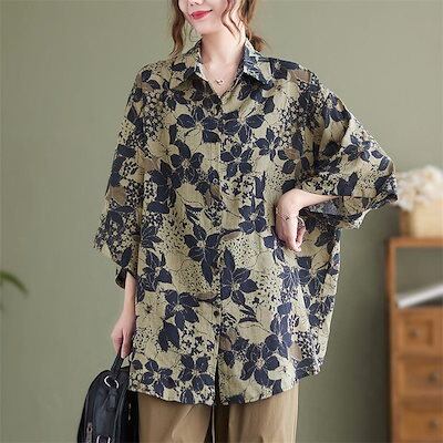 チュニックシャツ レディース きれいめ 紫外線対策 春夏新作 折り襟 半袖 プリント 花柄 ひざ丈スカートオシャレ カジュアル ゆったり