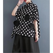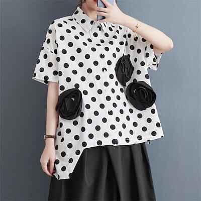 春夏 シャツ レディース 半袖 折り襟 前開き 花飾り 立体感あり 大人可愛い ドット柄 自然に体型カバー 裾 不規則 トレンド感ある仕上がり