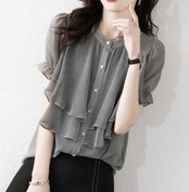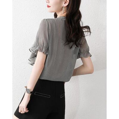 レディースファッショントップスブラウス袖あり5分袖パフスリーブバルーンスリーブUネック襟なしシャツ襟ワイド切り替えデザインシフォンフリル前開きストライプXL2XL大きいサイズ102030
