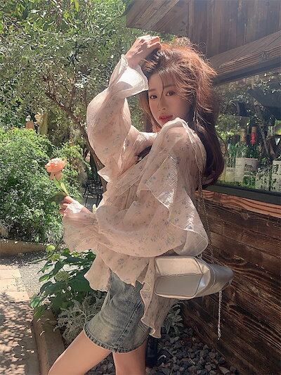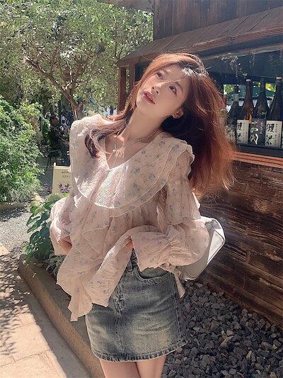 トップス シャツ ブラウス 長袖 ポエットスリーブ Vネックオフィスシフォンシャツレディース長袖ルーズ 襟 花柄 フリル 白 かわいい おしゃれ 夏 韓国ファッション レディース