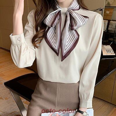 2025 春 夏 シャツ レディース ブラウス リボン 長袖 立ち襟 シフォン シャツ トップス 柄 リボンタイ オフィス レトロ 今っぽシアーシャツ 韓国ファッション