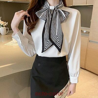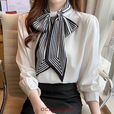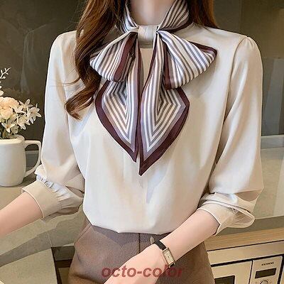 ボウタイ ブラウス リボン レディース 長袖 ボウタイブラウス 立ち襟 シフォン シャツブラウス トップス 柄 華やか リボンタイ オフィス カジュアル レトロ