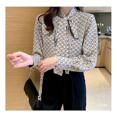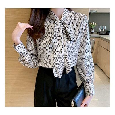 ボウタイ レトロ 柄 ブラウス 長袖 レディース トップス 上品 きれいめ 事務服 シャツ リボンタイ ボウタイブラウス リボンブラウス パーティー フォ