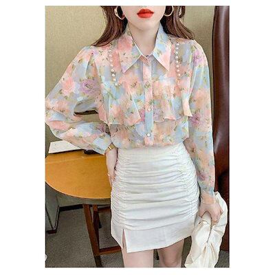 (wusu0bici)迅速な出荷シャツ ブラウス フラワープリント パール 長袖 シャツ レディース トップス 花柄 無地 透け感 シースルーシャツ 薄手 柄 シャツ 折襟 ゆった