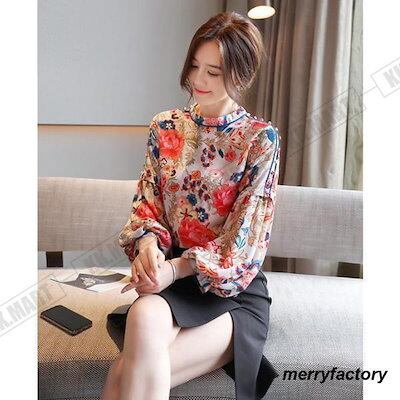 ブラウス シャツ レディース バルーンスリーブ 花柄 シフォン 長袖 柄シャツ パフスリーブ フレアスリーブ 総柄