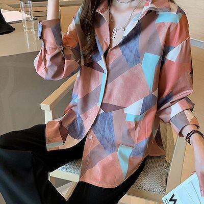 ブラウス シャツ トップス レディース 個性的 長袖 春 柄 ピンク ブルー 2色展開 襟付き フロントボタン 前開き 休日 お出かけコーデ 普段使い 通勤 着回し ファッシ