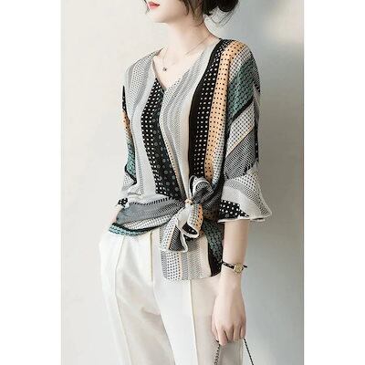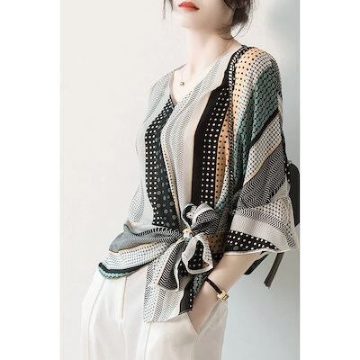 シャツブラウス レディース とろみ おしゃれ ユッタリ 長袖 通勤 L 柄 シフォン ドッキング