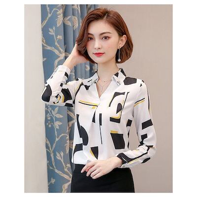 シフォンブラウス レディース 長袖 ビジネス カジュアルシャツ 柄 Vネック フォーマルプルオーバー トップス おしゃれ きれいめ 春秋 vivishow