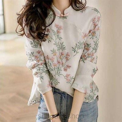 ブラウス シャツ 長袖 チャイナ シャツ トップス 花柄 チャイナシャツ レディース 立ち襟 ハイネック 花柄 おしゃれ かわいい チャイナボタン 綿麻調 刺繍 春